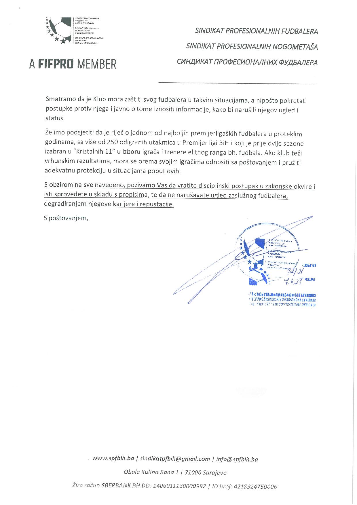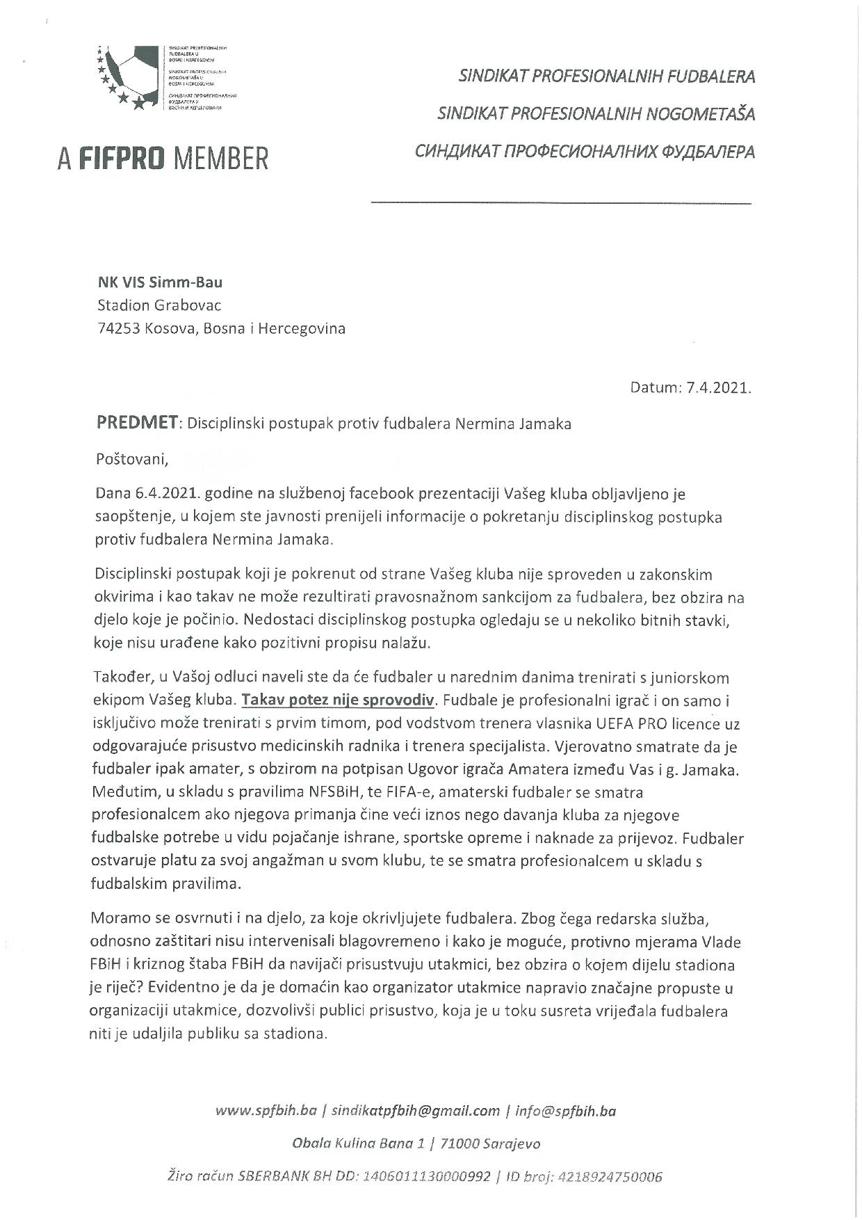 Sindikat profesionalnih fudbalera u Bosni i Hercegovini obratio se danas članu 1. lige FBiH, ekipi NK Vis Simm Bau, koja je započela disciplinski postupak protiv fudbalera Nermina Jamaka.